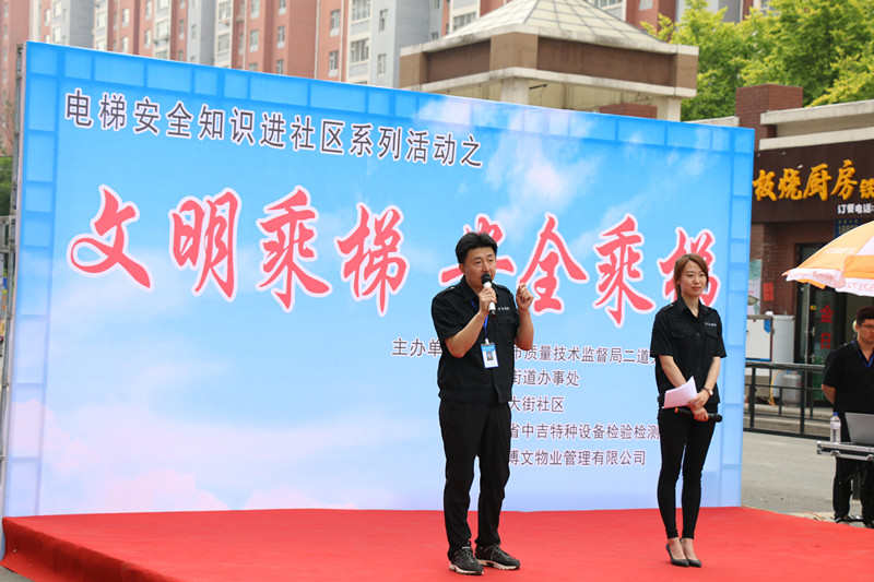 為迎接我國第十六個“安全生產(chǎn)月”, 6月17日上午9:00,由長春市質(zhì)量技術(shù)監(jiān)督局二道分局、會展街道辦事處、會展大街社區(qū)、吉林省中吉特種設(shè)備檢驗檢測有限公司、長春博文物業(yè)管理有限公司,在福臨家園小區(qū)共同舉辦電梯安全知識進社區(qū)之“文明乘梯 安全乘梯”宣講、電梯應(yīng)急救援演練兩場活動。
